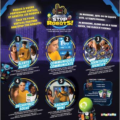Stop the Robots est un jeu où votre sens de l’observation, votre esprit critique et votre rapidité seront mis à l’épreuve! Votre mission : seul ou en équipe, identifiez les robots grâce aux indices donnés par votre partenaire virtuel. Ensemble, solutionnez des énigmes pour désactiver les robots qui menacent la ville. Faites vite, le temps presse?!