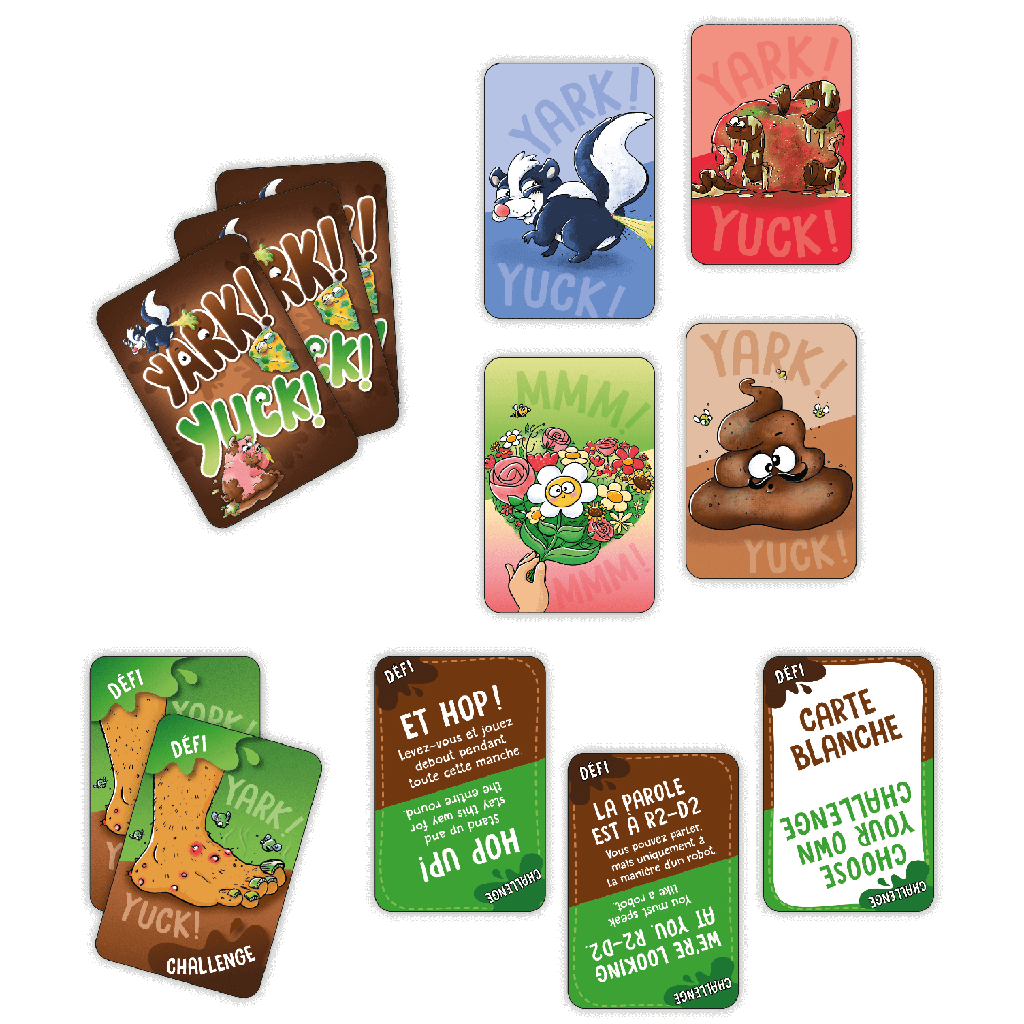 Vous vous êtes donné le défi d’être le plus dégueu de votre bande d’amis. Les joueurs doivent donc ramasser des séries de 5 images répugnantes identiques. Pour y arriver, ils effectuent des échanges entre eux, tout en se méfiant des fleurs qui sentent beaucoup trop bon! On ne peut pas compléter une série avec des cartes FLEURS. Par contre, les cartes FLEURS peuvent passer pour n’importe quelle image lors des échanges. À Yark!, il n’y a pas de tours: tout le monde joue en même temps. Des défis spéciaux rendent le jeu encore plus fou et plus chaotique qui sortiront le clown en vous! Rires et dégoût garantis!
